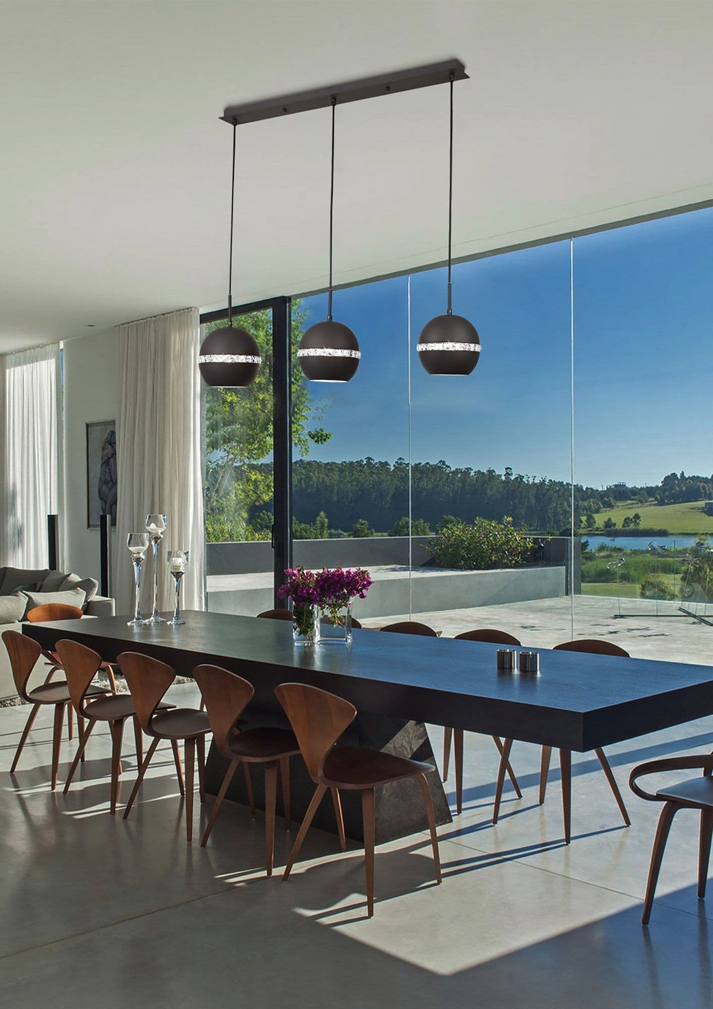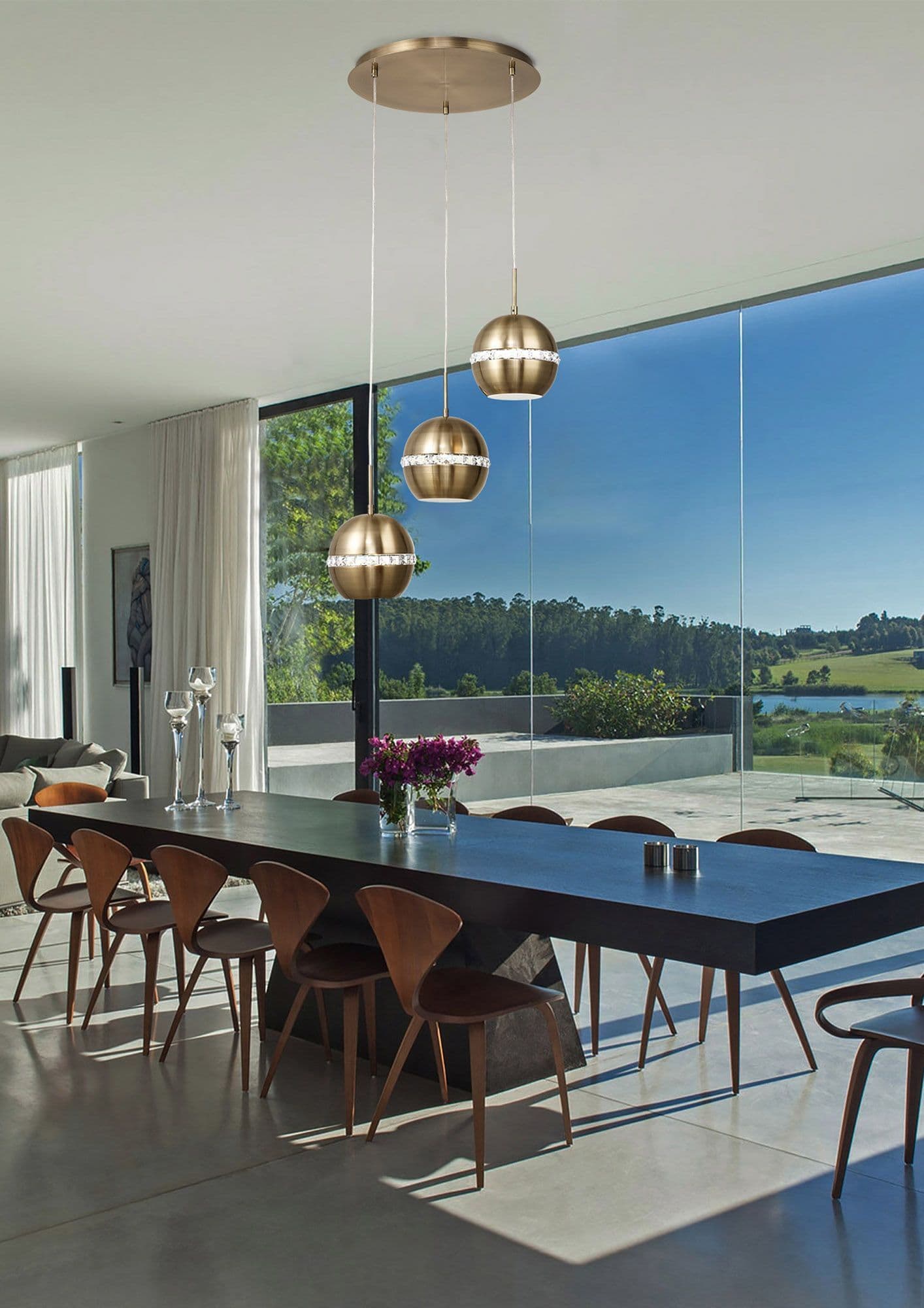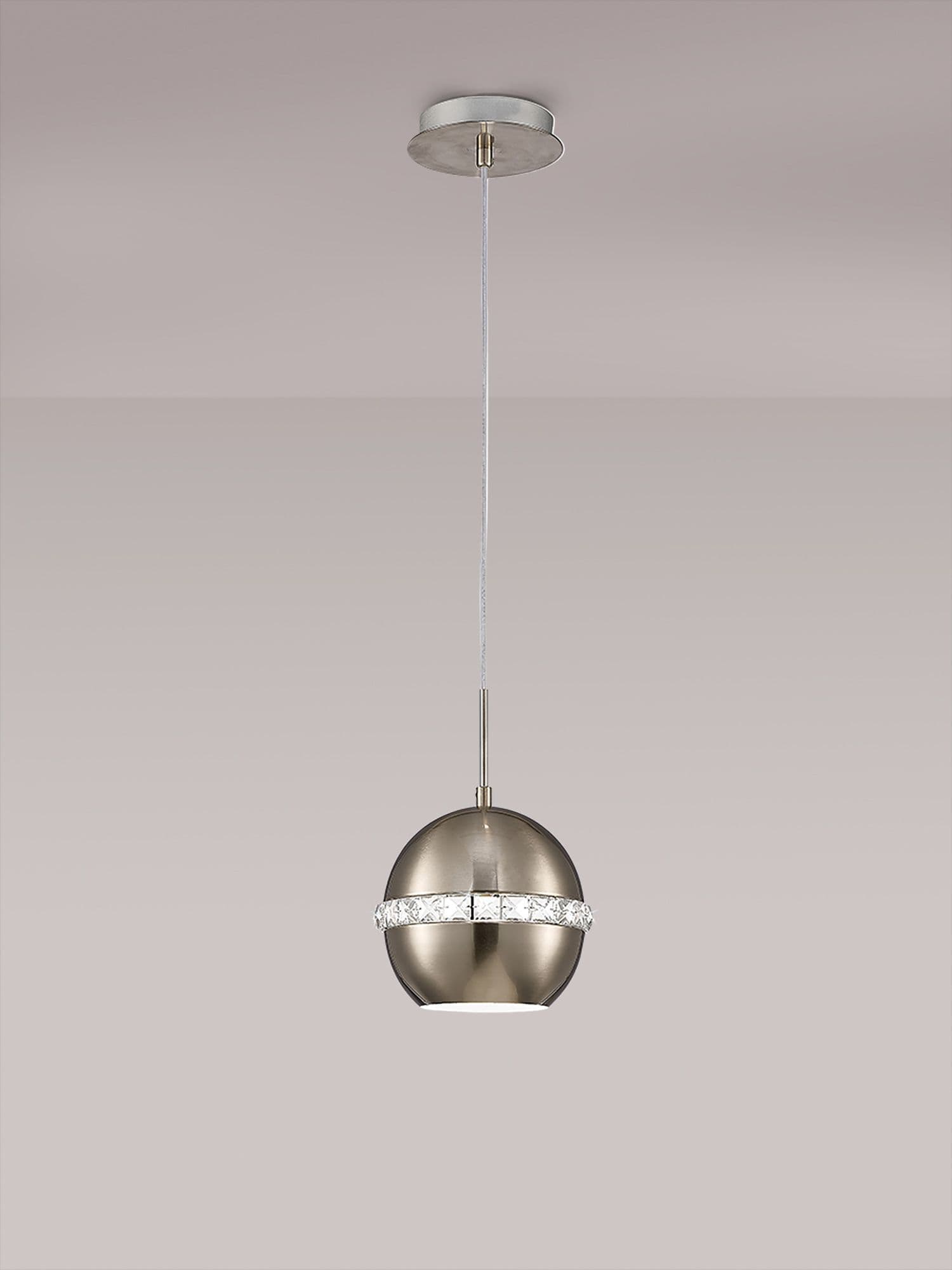 Allan is an elegant set of pendant lights that are glamorous and Classic. Finished in either Satin Copper or Satin Nickel, the dome shape is divided by a ribbon of crystal around the middle that adds a subtle sparkle. The pendants generally cast the light downwards but the crystal centre also provides an amount of general light into the surrounding space.