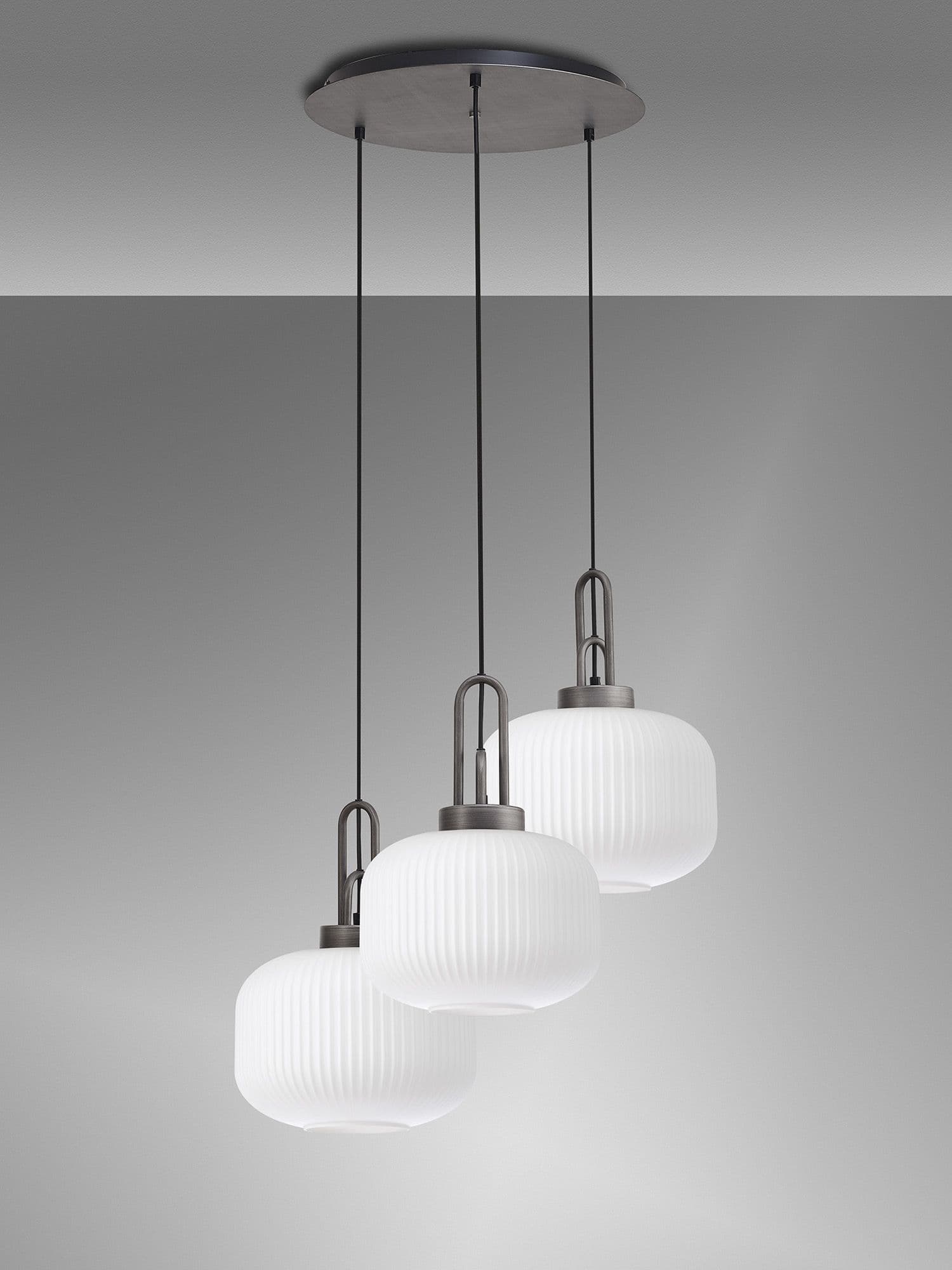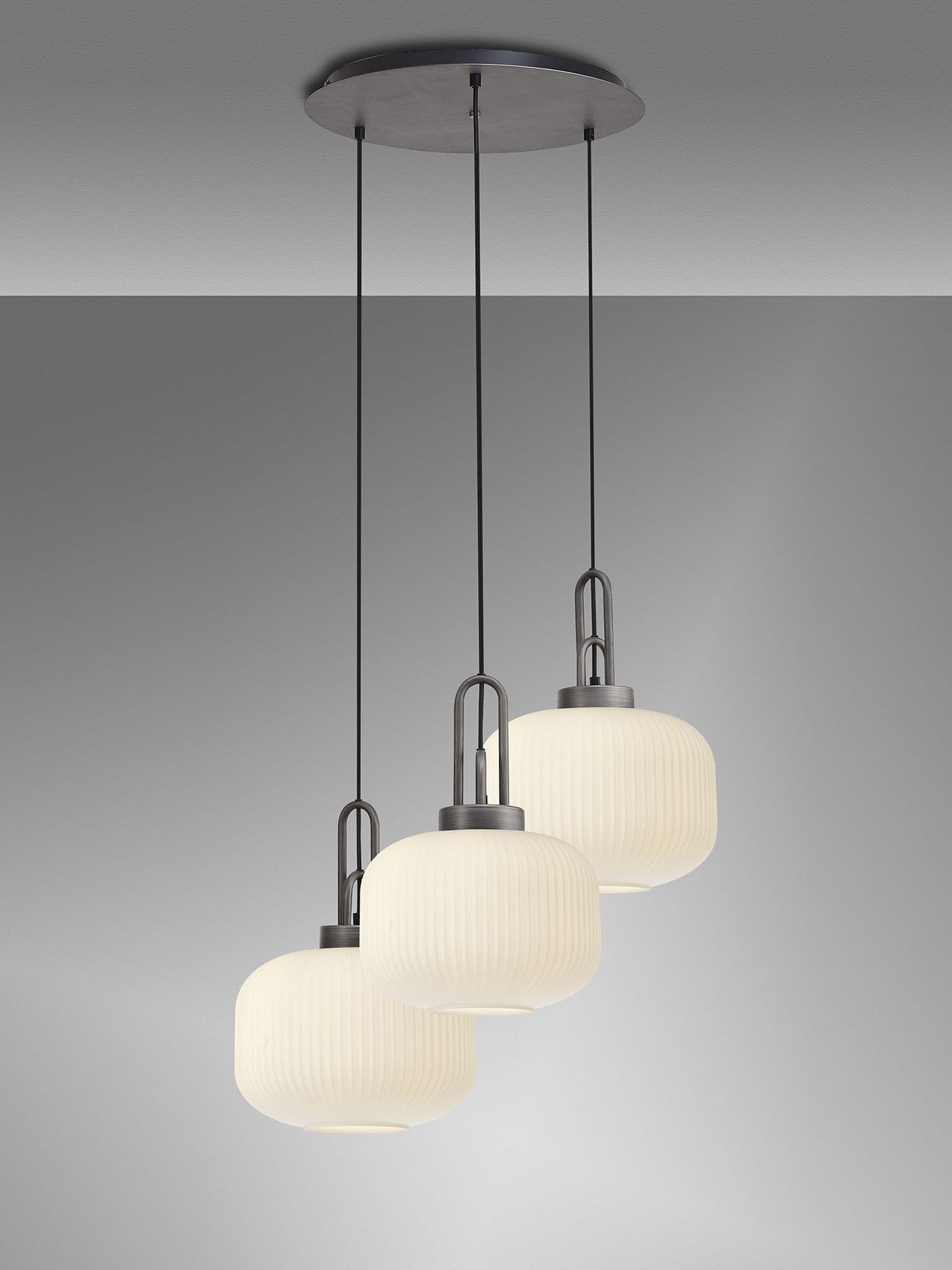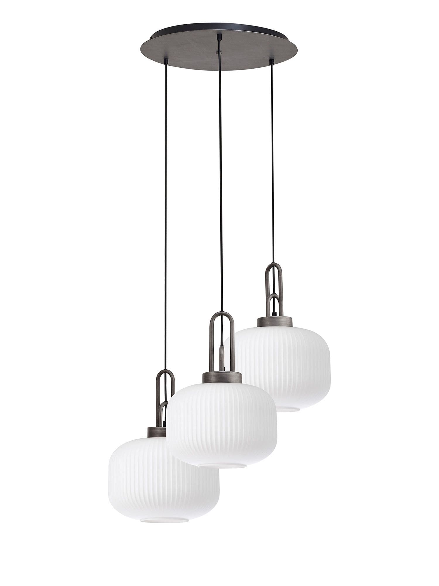 Brief Description:Barcelona 2m Round Suspension Kit, 3 x E27, Antique Silver/Matt Black With 30cm Pumpkin Shaped Ribbed Champagne Glass