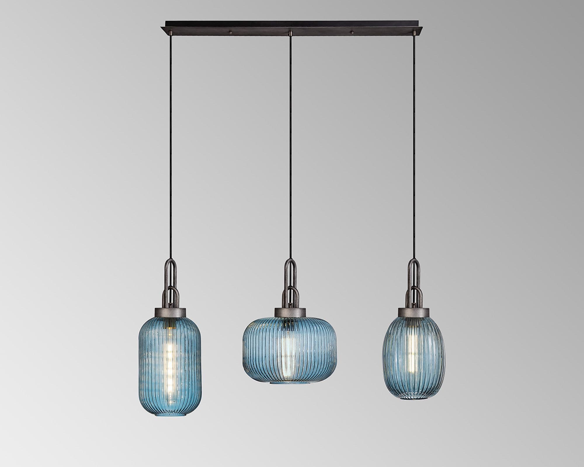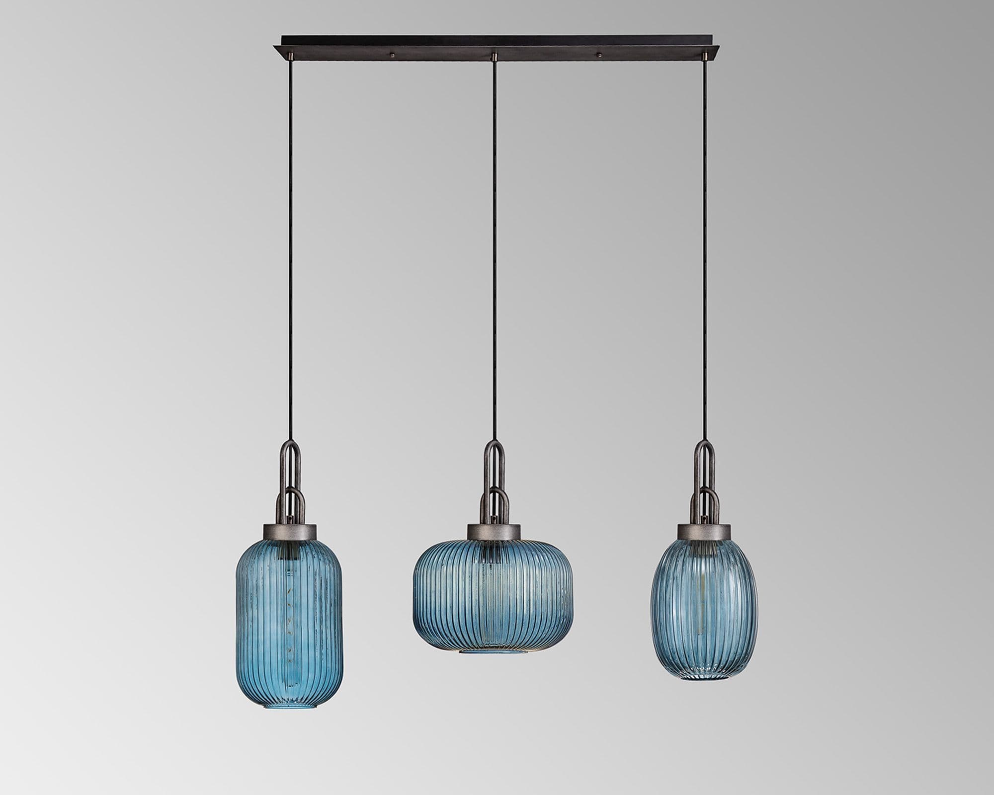 Brief Description:Barcelona Linear Pendant 3 x E27 With Various Glasses, Aged Pewter/Petrol Blue/Matt Black