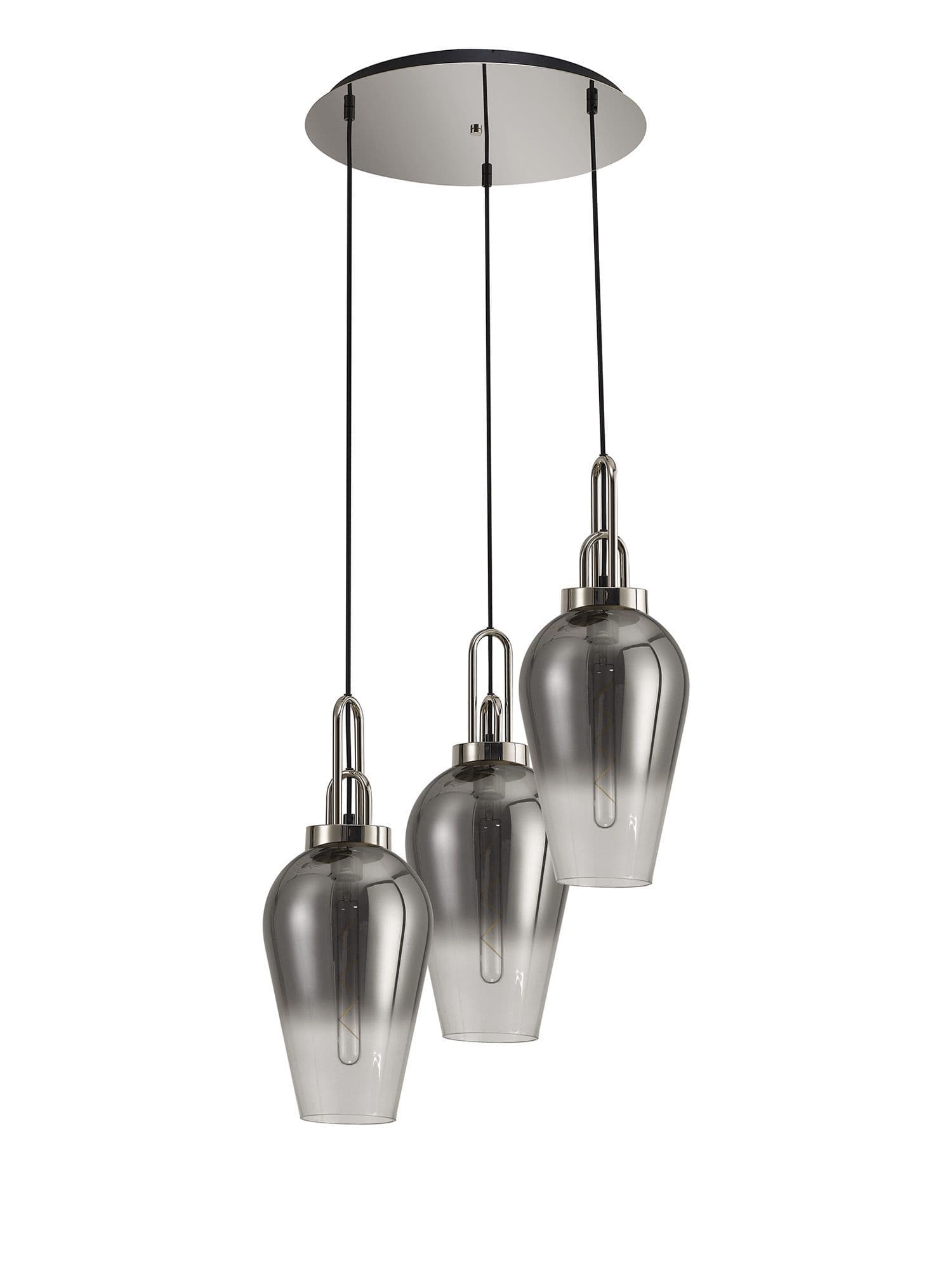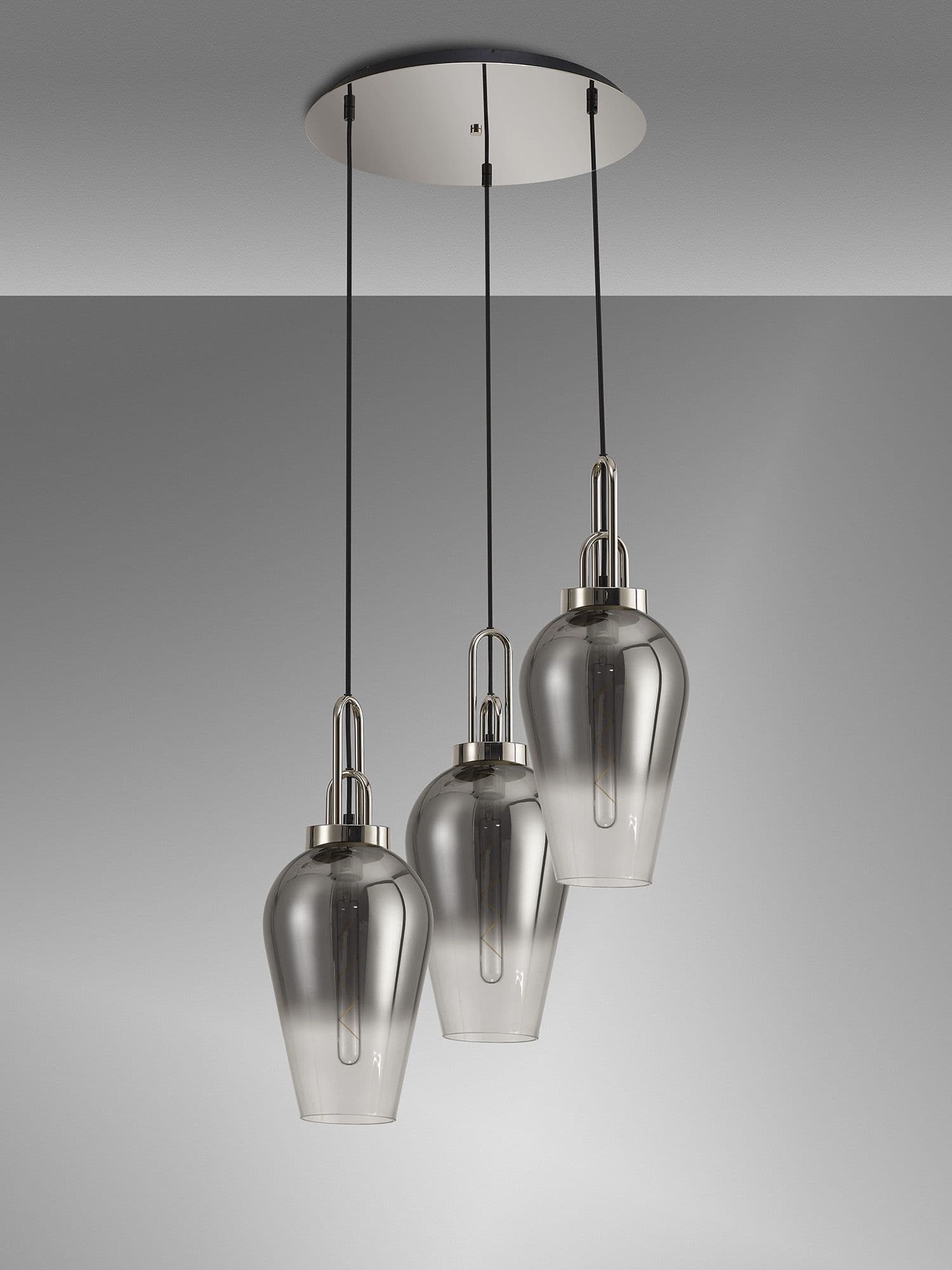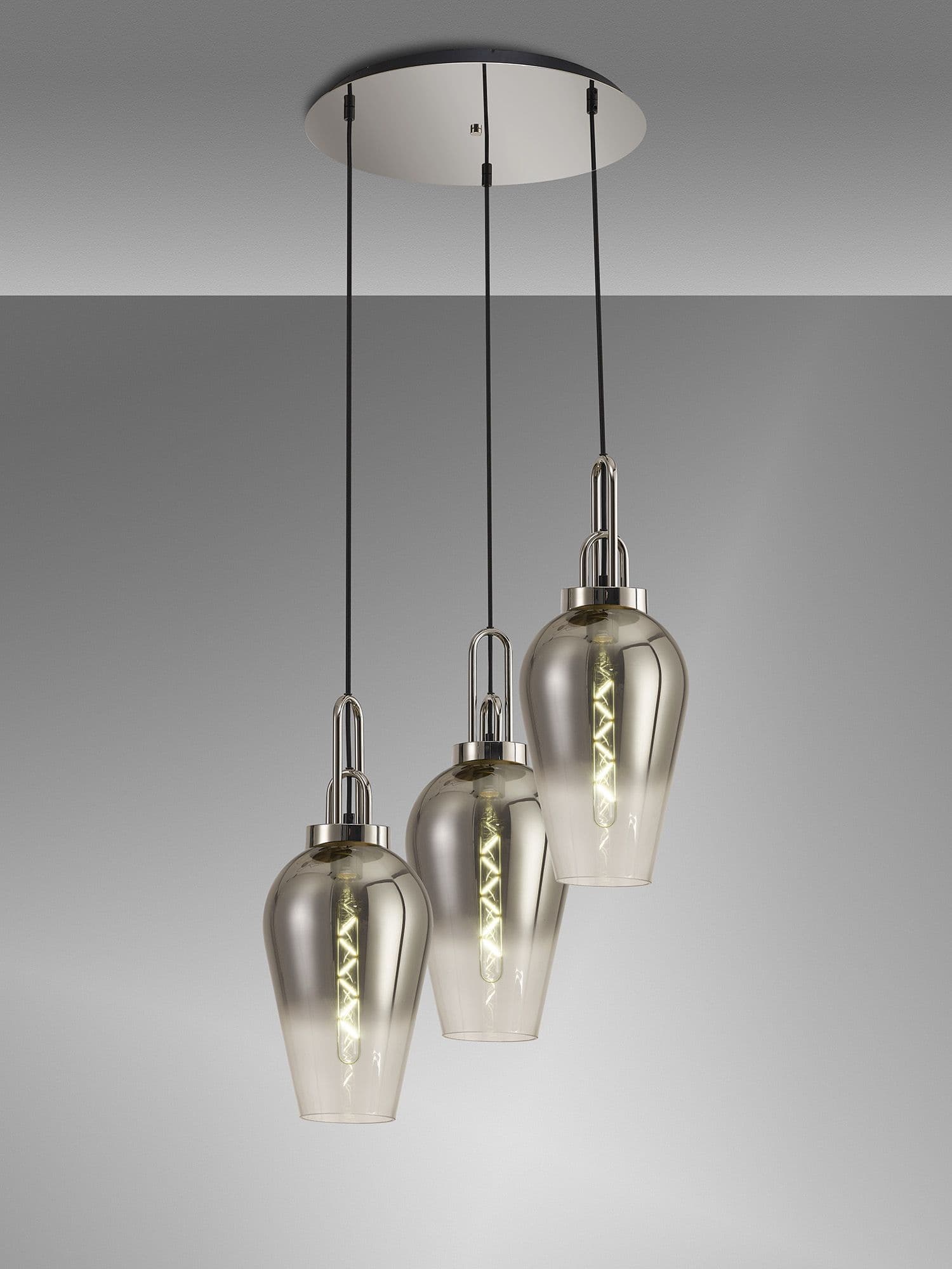 Brief Description:Barcelona Round 3 Light Pendant With 23cm Pear Glass, Black Chrome/Matt Black Smoked/Clear