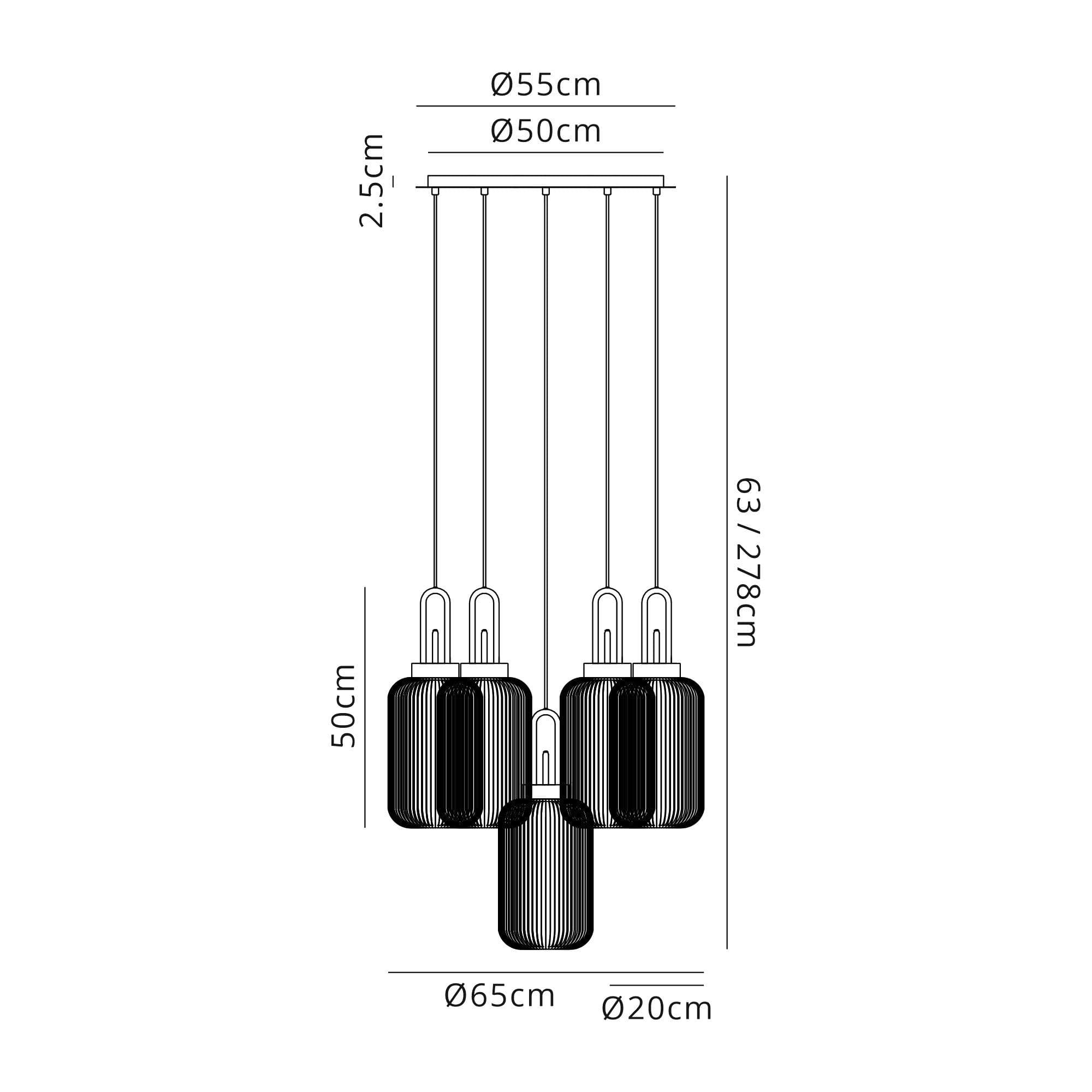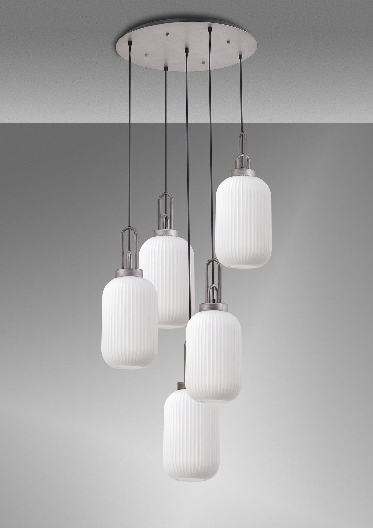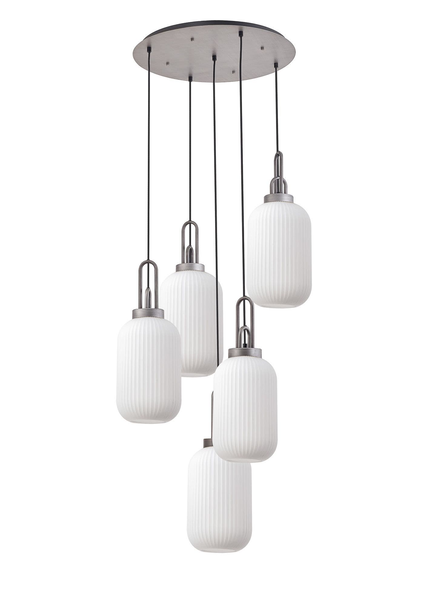 Brief Description:Barcelona Round 5 Light Pendant With 20cm Tubular Ribbed Glass, Aged Pewter/Matt Black Champagne