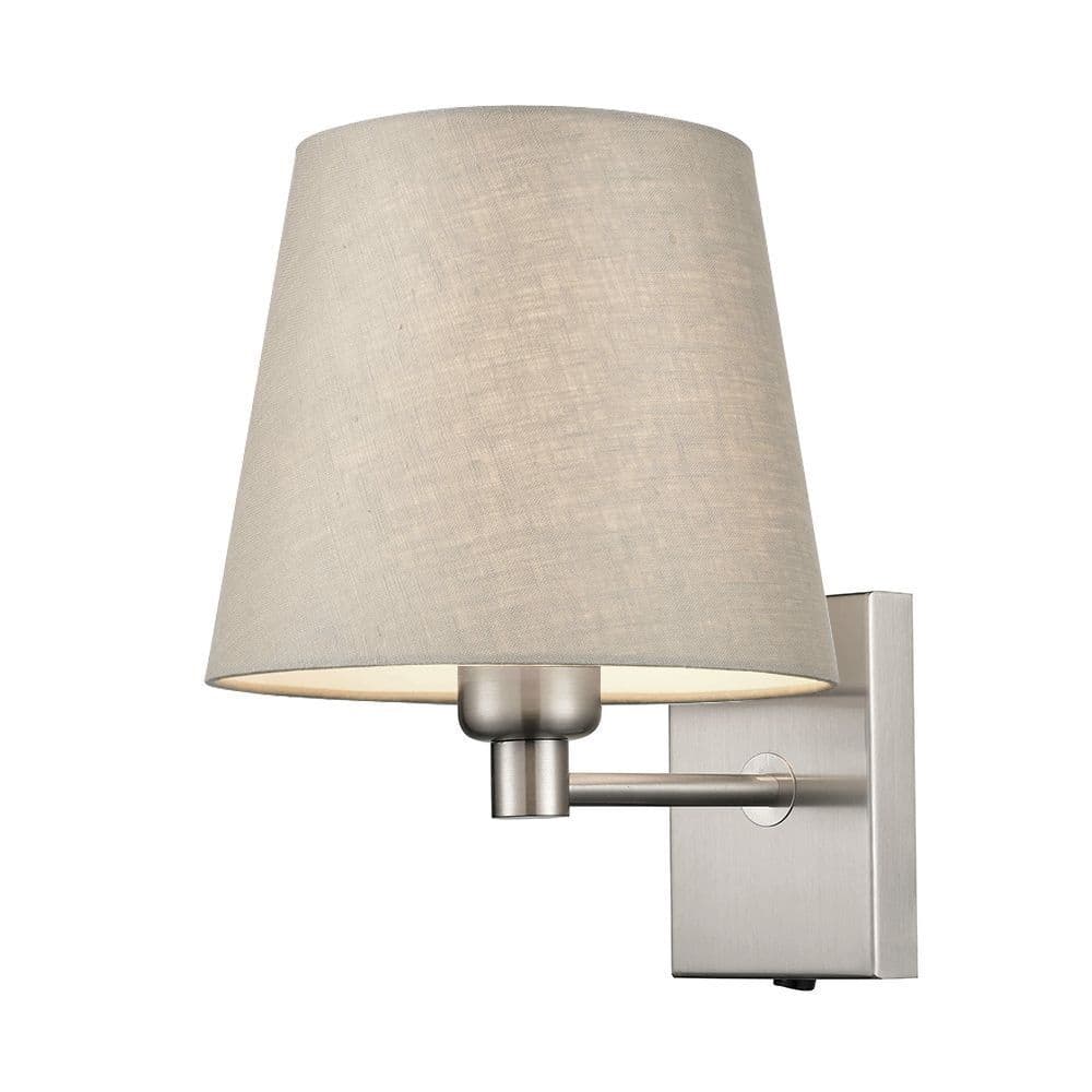 Switched wall bracket in satin nickel finish with a grey linen shade. There is a switch at the base of the backplate.