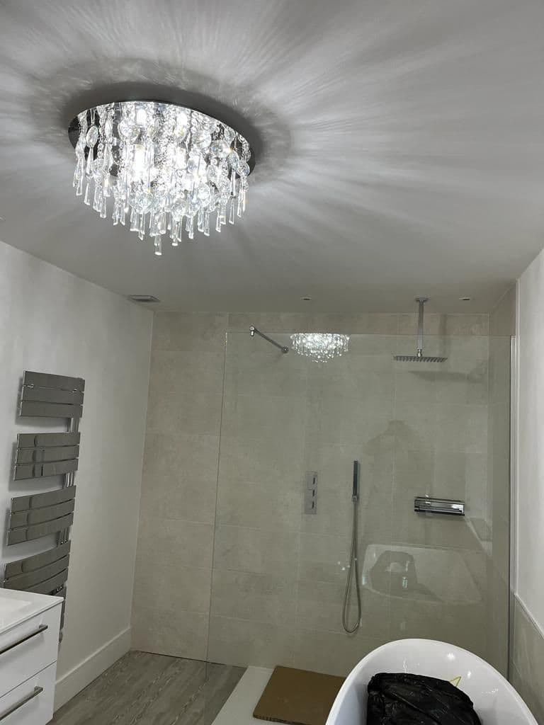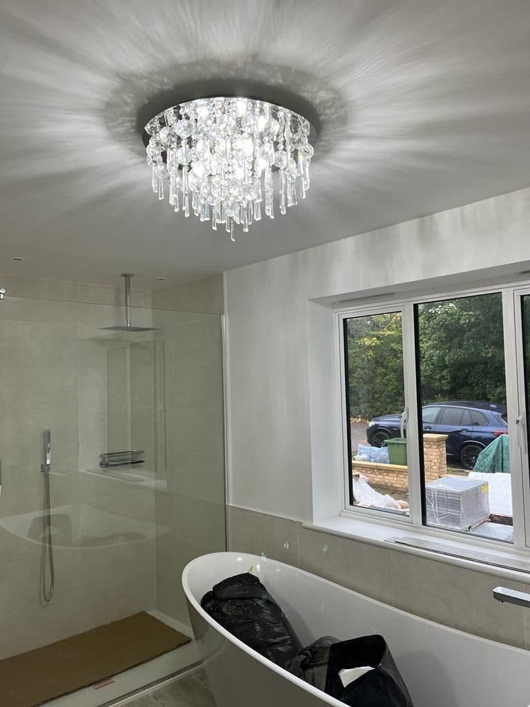 Family Description:Chrome finish flush ceiling fittings with a mass of crystal glass drops. Rated IP44. Supplied with mains voltage halogen lamps.